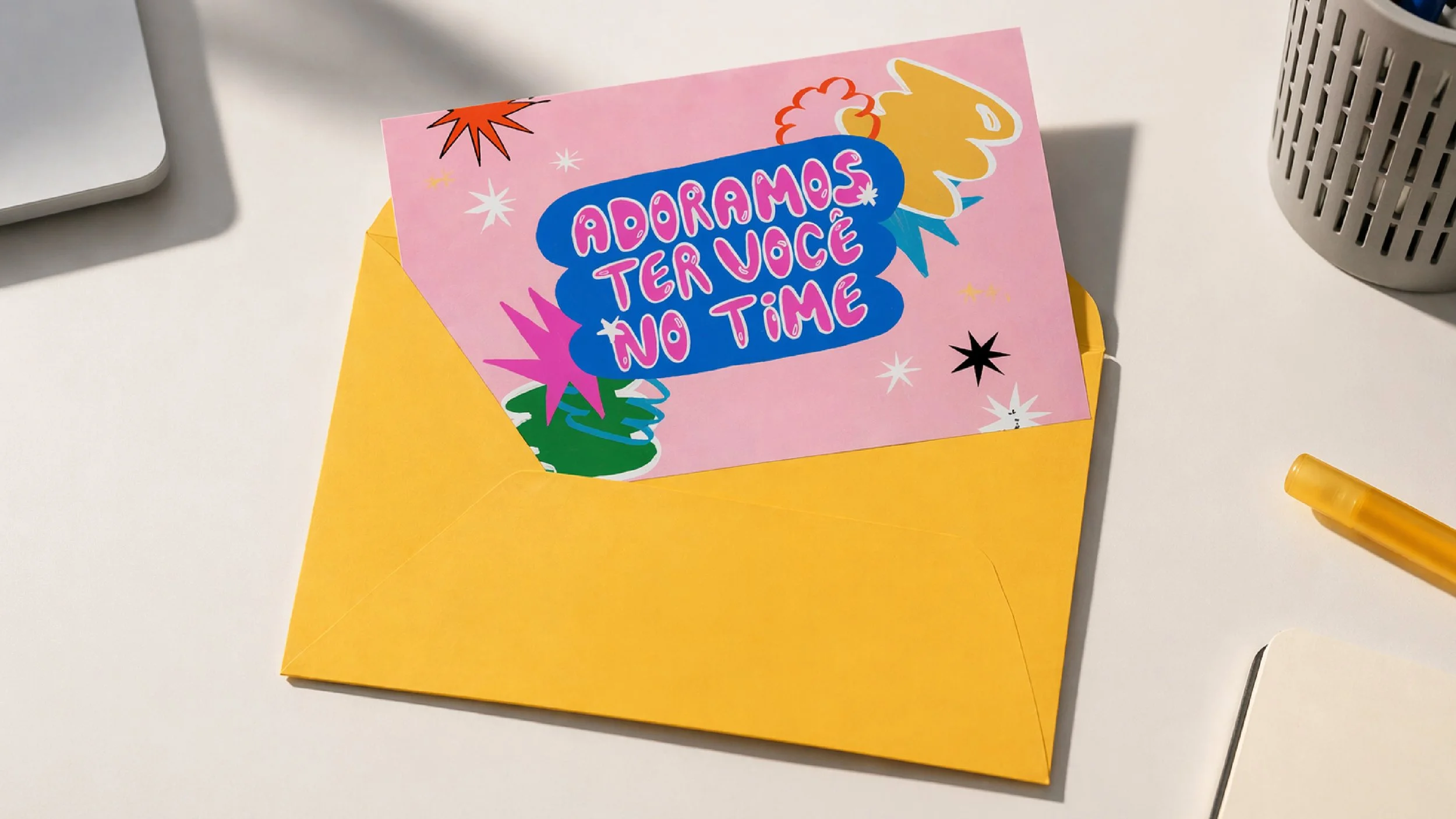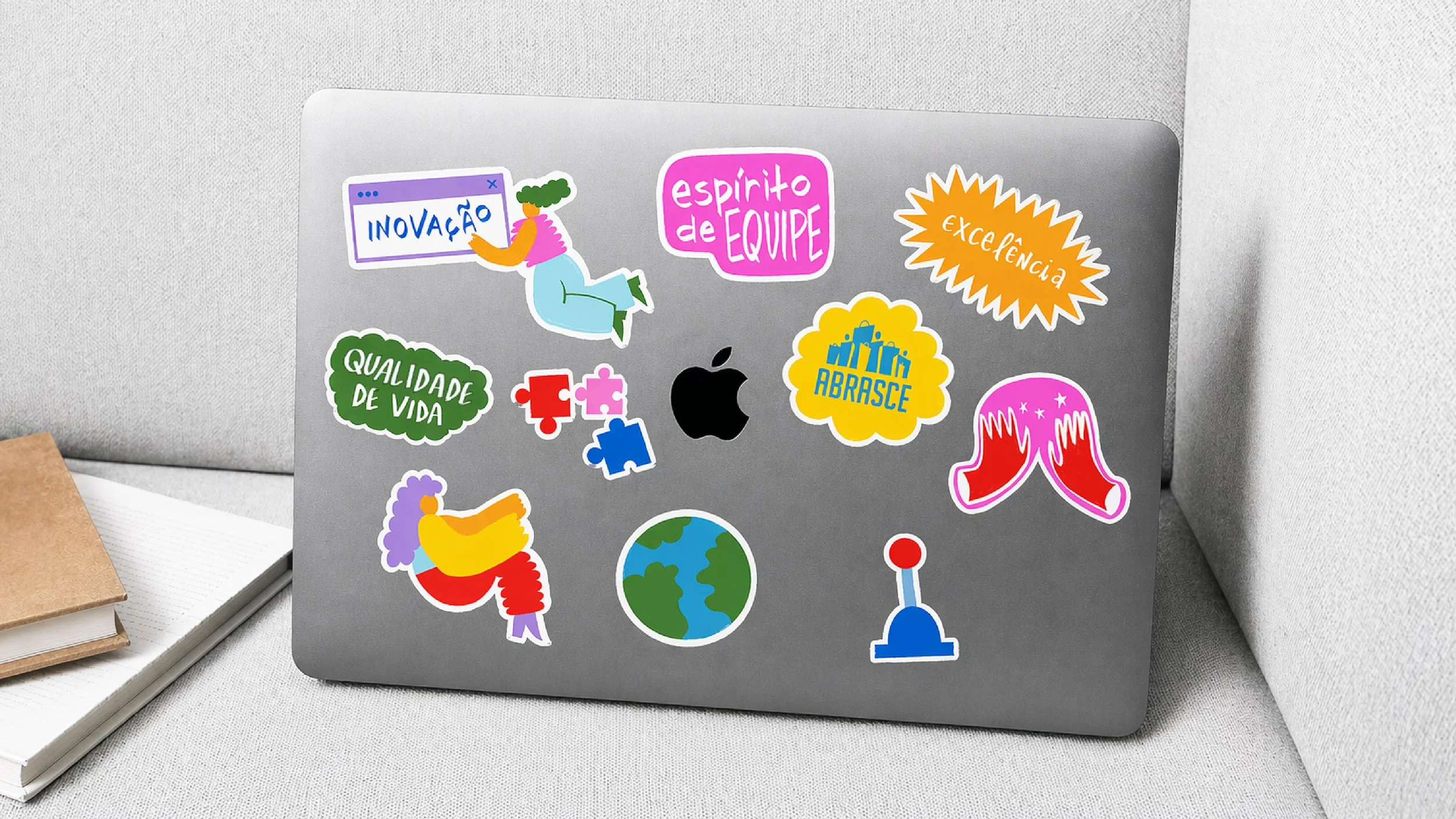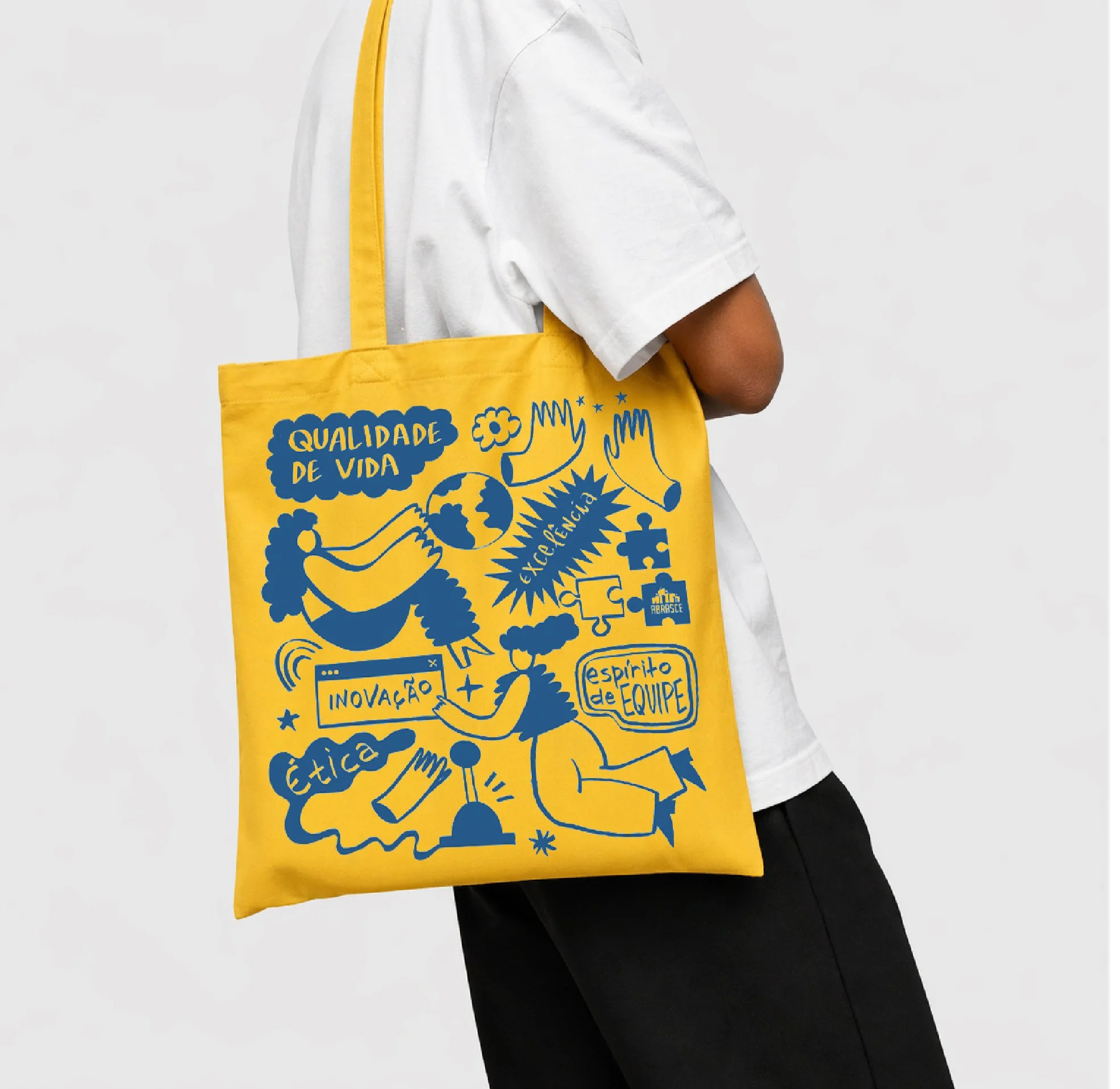 Este kit de boas-vindas foi criado para recepcionar os novos funcionários da Abrasce com uma experiência acolhedora, composta por cartão, cartela de stickers e ecobag. A Zootz foi responsável pelas ilustrações e pelas artes aplicadas nos produtos.